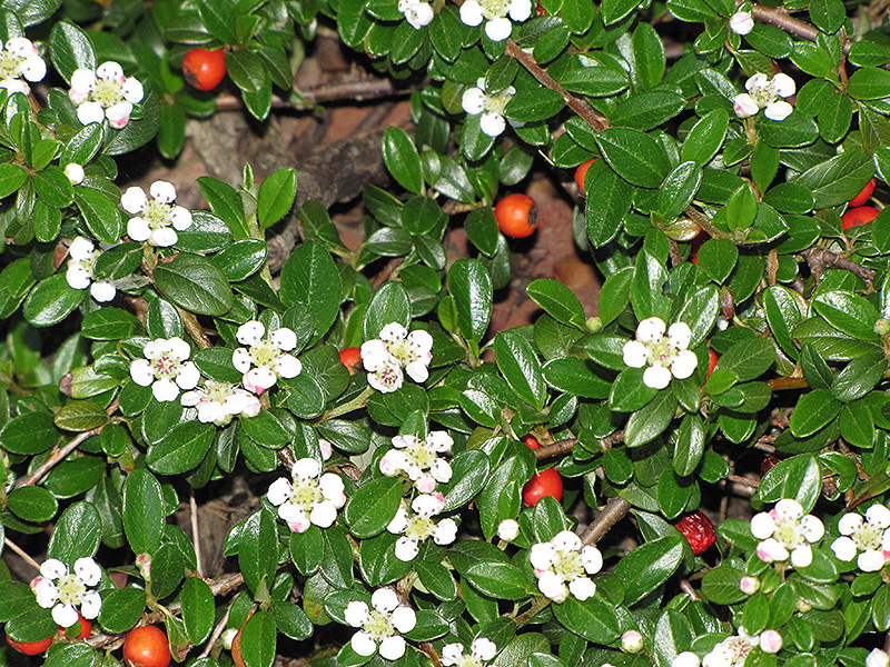 One of the best low spreading groundcovers, featuring white flowers in spring and showy coral pink fruit in fall, evergreen leaves require adequate snow cover or protection from winter sun and wind in exposed locations