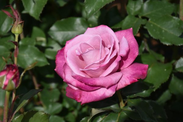 Fragrant Plum Rose is covered in stunning fragrant lavender flowers with pink edges at the ends of the branches from early summer to early fall. The flowers are excellent for cutting. It has dark green deciduous foliage. The oval compound leaves turn yellow in fall.
